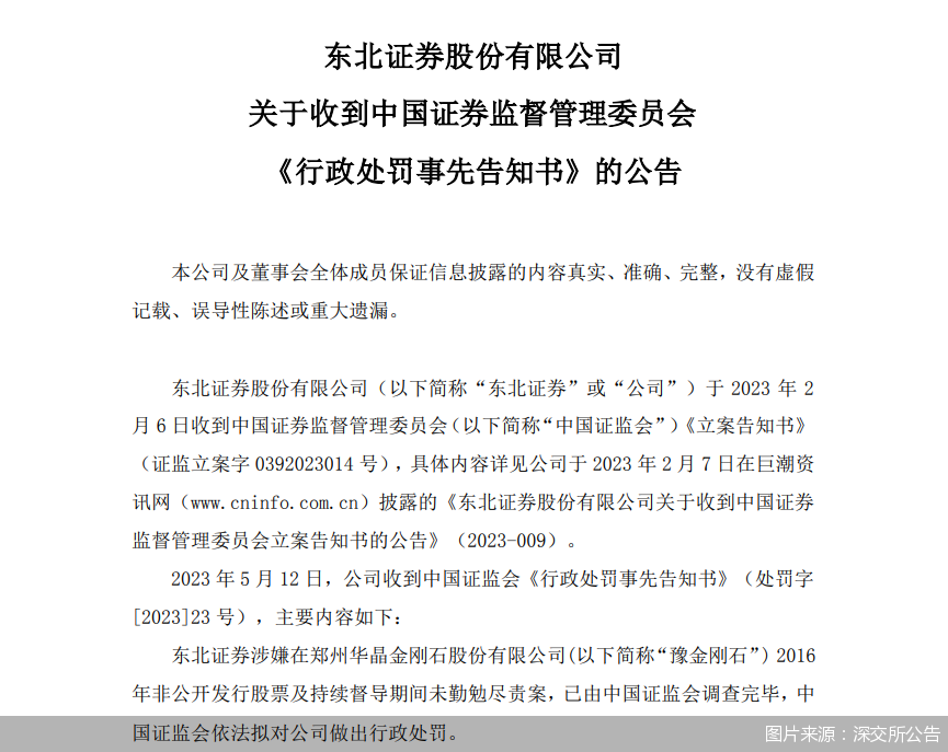 7年旧案被翻出,东北证券难逃其咎。5月14日,东北证券发布公告表示,5月12日,公司收到中国证监会《行政处罚事先告知书》,指出东北证券涉嫌在豫金刚石2016年非公开发行股票及持续督导期间未勤勉尽责案,证监会依法拟对东北证券做出行政处罚。