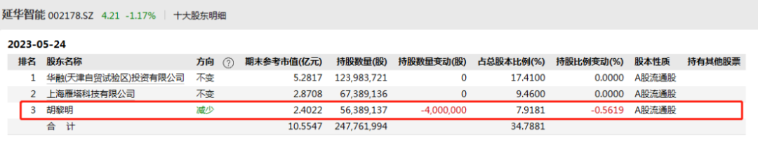 数据显示,截至5月24日,该公司第一大股东为华融(天津自贸试验区)投资有限公司,持股比例17.41%;胡黎明持股数量减少了400万股,不过仍以7.92%的持股比例位列公司第三大股东。