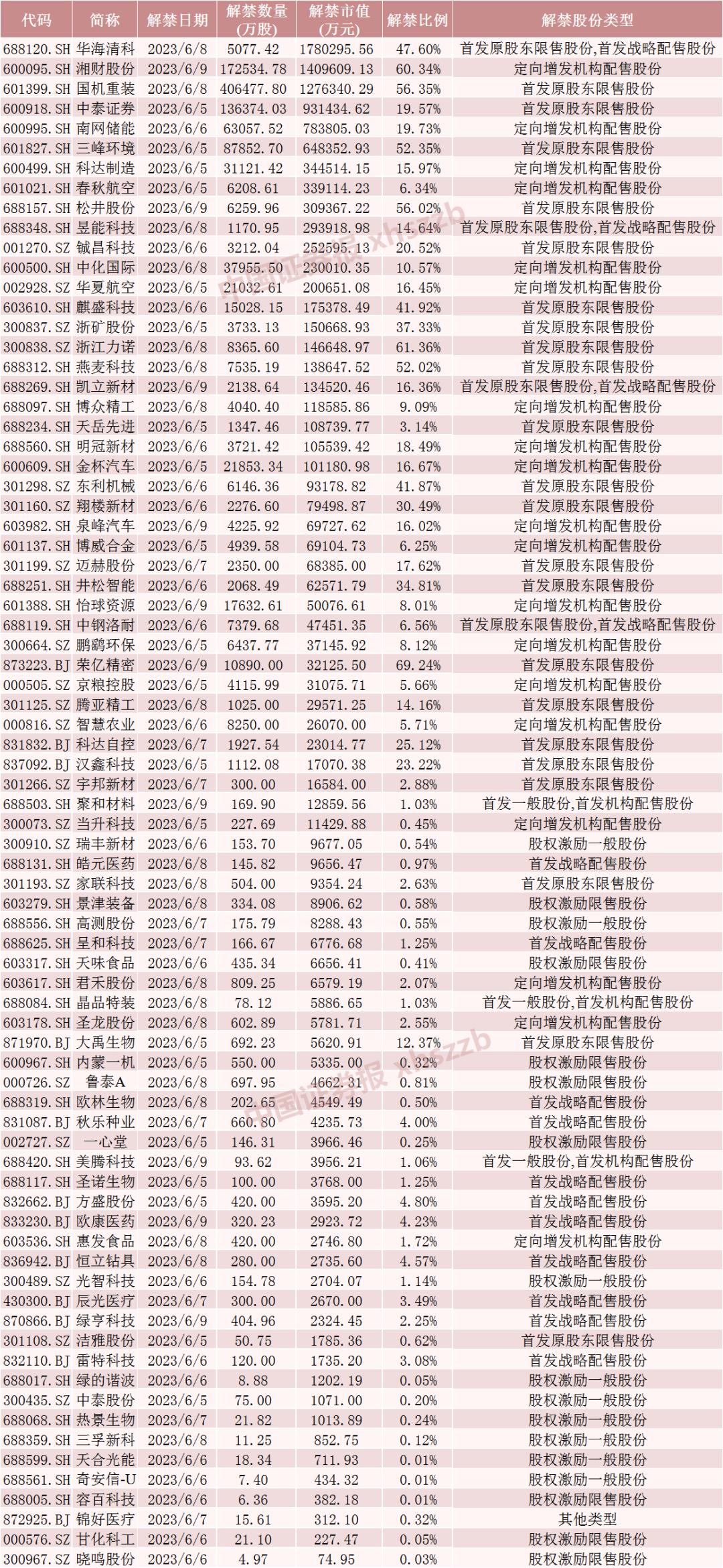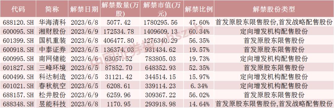 具体来看,数据显示,华海清科6月8日将解禁5077.42万股,为首发原股东限售股份和首发战略配售股份。湘财股份6月9日将解禁17.25亿股,均为定向增发机构配售股份。国机重装6月8日将解禁40.65亿股,均为首发原股东限售股份。