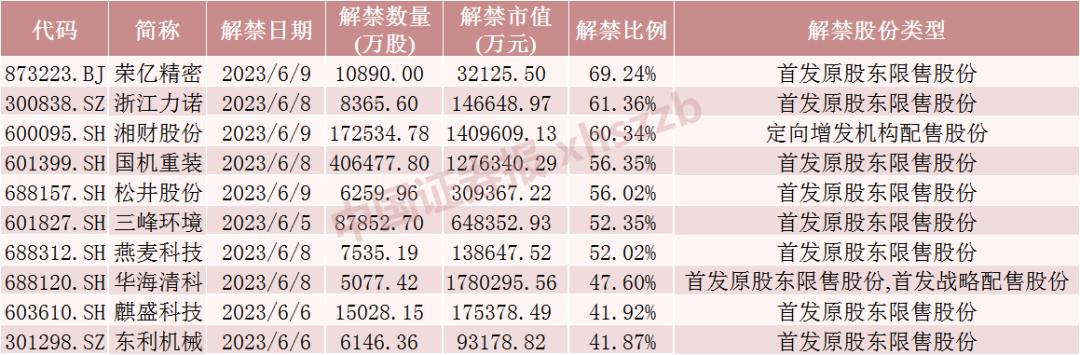 数据显示,在下周面临解禁的77只股票中,有7只股票解禁股数量占总股本比例超过50%,分别为荣亿精密、浙江力诺、湘财股份、国机重装、松井股份、三峰环境、燕麦科技,解禁比例分别为69.24%、61.36%、60.34%、56.35%、56.02%、52.35%、52.02%。与当前流通股相比,这7只股票下周解禁后流通盘将分别增加225.07%、158.79%、152.17%、129.09%、127.40%、109.85%、108.43%。此外,华海清科、东利机械、浙矿股份、井松智能、翔楼新材、南网储能下周解禁后流通盘将分别增加202.34%、167.02%、112.27%、146.55%、121.96%、131.77%,即下周共有13只股票解禁后流通盘增加超1倍。
