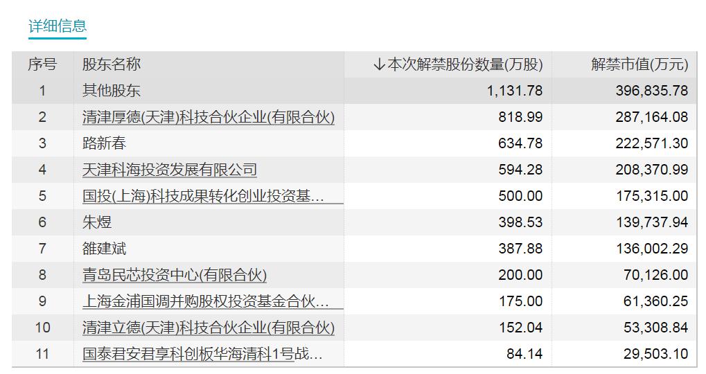 具体来看,在下周面临解禁的77只股票中,解禁市值最大的华海清科解禁股东分别为清津厚德(天津)科技合伙企业(有限合伙)、路新春、天津科海投资发展有限公司等多个股东,其中清津厚德(天津)科技合伙企业(有限合伙)为华海清科第二大股东。