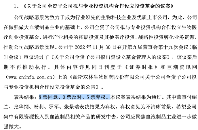 3月17日,派林生物董事会审议子公司拟与专业投资机构合作设立生物医疗创业投资基金的议案,包括付绍兰在内的5名董事投出弃权票。弃权意见为希望公司集中有限资源投入血液制品相关产品研发,聚焦血液制品主业做强做大。