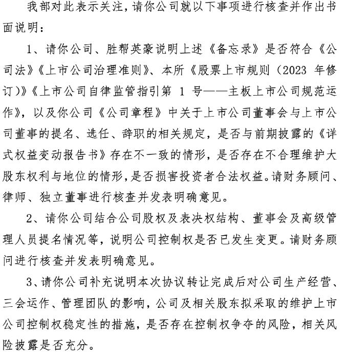 深交所要求公司、胜帮英豪说明,《备忘录》是否符合《公司法》《上市公司治理准则》、本所《股票上市规则(2023年修订)》《上市公司自律监管指引第1号——主板上市公司规范运 作》。以及公司《公司章程》中关于上市公司董事会与上市公司董事的提名、选任、辞职的相关规定,是否与前期披露的《详式权益变动报告书》存在不一致的情形。