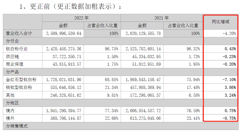 原来,在此前的年报中,金浦钛业工作人员将2022年公司各类产品营业收入的“同比增减”错误计算成“2022年各类产品营收占总营收比重—2021年各类产品营收占总营收比重”,而各类产品2022年营收“同比增减”的正确计算方法应当是“(2022年营收金额—2021年营收金额)÷2021年营收金额×100%”。在更正之后,金浦钛业终于将“同比增减”算对了。
