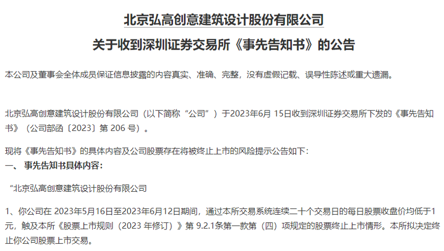 *ST弘高公告称,公司股票在2023年5月16日至2023年6月12日期间,通过深圳证券交易所交易系统连续20个交易日的每日股票收盘价均低于1元,深圳证券交易所拟决定终止公司股票上市交易。