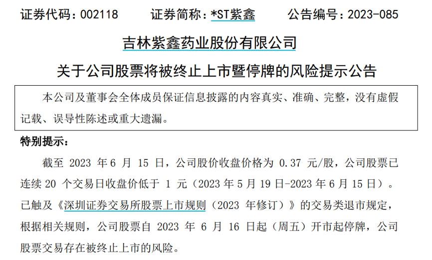 *ST紫鑫公告,截至2023 年6月15日,公司股价收盘价格为0.37元/股,公司股票已连续20个交易日收盘价低于1元(2023年5月19日-2023年6月15日)。已触及交易类退市规定,根据相关规则,公司股票自2023年6月16日起(周五)开市起停牌,公司股票交易存在被终止上市的风险。公司股票不进入退市整理期。