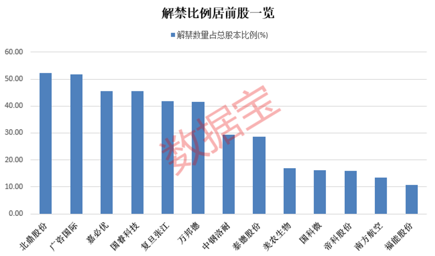 国睿科技的解禁规模次之,下周将有5.65亿股上市流通,解禁股主要为定向增发机构配售股份,解禁市值达87.2亿元。
