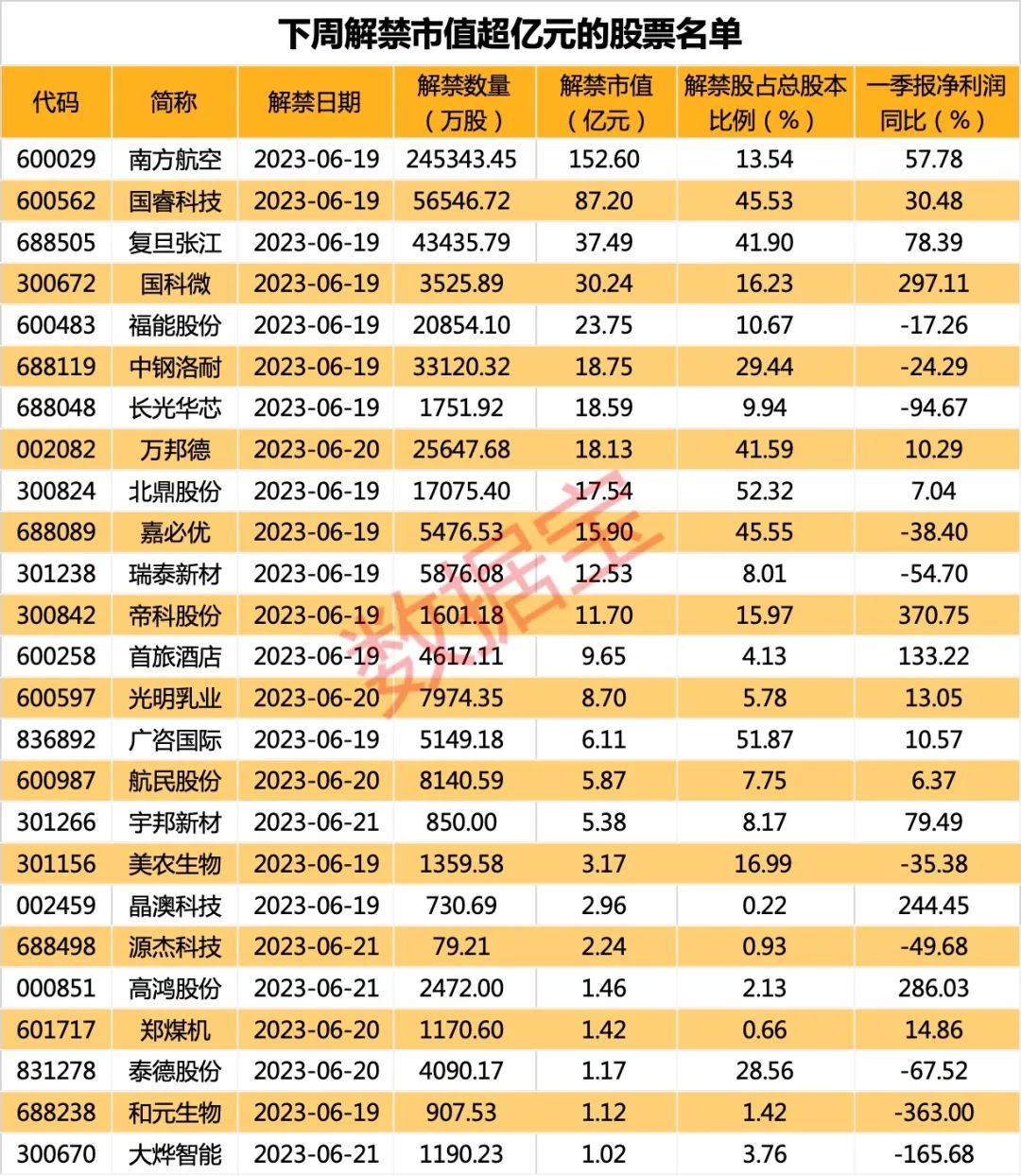 南方航空解禁市值规模最大,下周将有24.53亿股上市流通,主要为定向增发机构配售股份,解禁市值达152.6亿元。