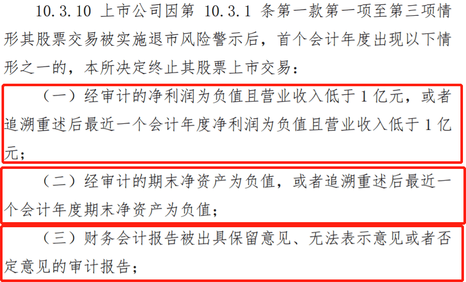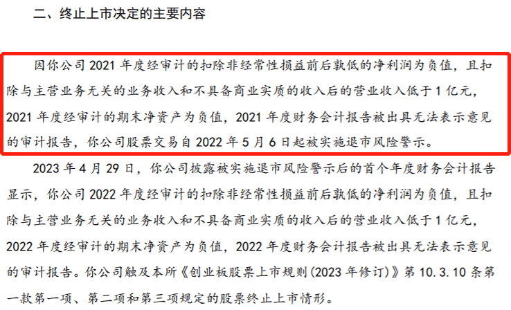 其次,文化退在2022年度,出现了与2021年度相同性质的财务指标和审计意见。深交所指出,公司触及《深圳证券交易所创业板股票上市规则(2023年修订)》第10.3.10条第一款第一项、第二项和第三项规定的股票终止上市情形。