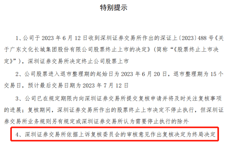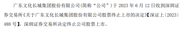 上述人员所指“倒闭”,主要是文化退将终止上市。2023年6月12日,文化退收到深交所《关于广东文化长城集团股份有限公司股票终止上市的决定》。