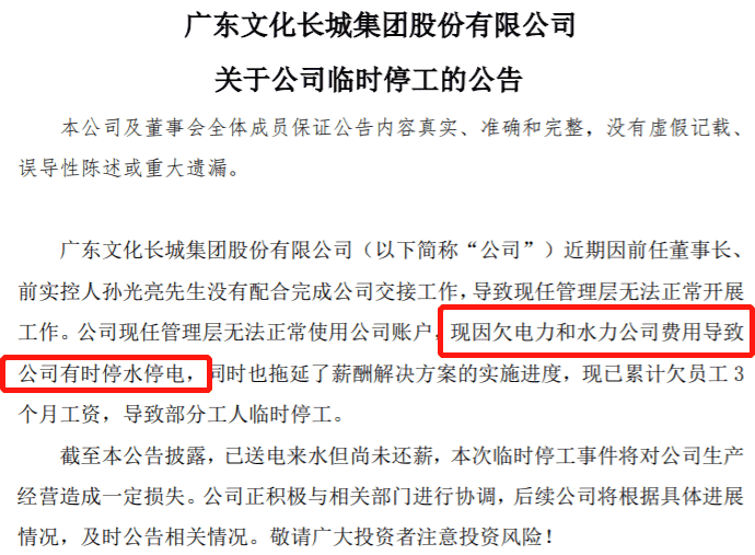 这并非文化退首次出现上述问题。2022年8月13日,*ST文化公告称,公司因欠电力和水力公司费用,导致有时被停水停电,同时拖延了薪酬解决方案的实施进度,已累计拖欠员工3个月工资,导致部分工人临时停工。