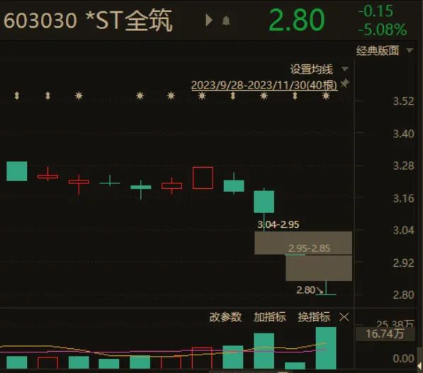 11月29日,重整计划草案亮相,*ST全筑当日无量跌停。11月30日,公司股价开盘略微上行,此后再度封于跌停板。两个交易日,*ST全筑股价累计跌幅近10%。截至12月1日收盘,*ST全筑报收于2.8元。