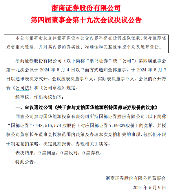 5月7日,浙商证券董事会审议通过《关于参与竞拍国华能源所持国都证券股份的议案》,同意公司参与国华能源投资有限公司所持国都证券448,516,574股股份(对应国都证券7.6933%股份)的竞拍,并授权公司董事长在董事会授权范围内决策及办理本次竞拍相关的事项,包括但不限于制定竞拍策略、决定竞拍报价、办理相关手续等。