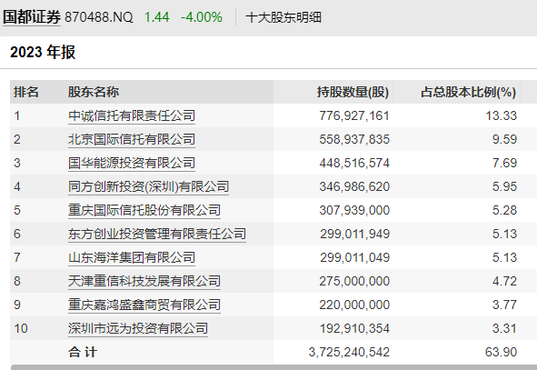 国都证券2023年年报显示,其第一大股东为中诚信托,持股比例为13.33%。中诚信托第二大股东国家能源集团资本控股有限公司,与国华能源投资有限公司同为国家能源投资集团的全资子公司。