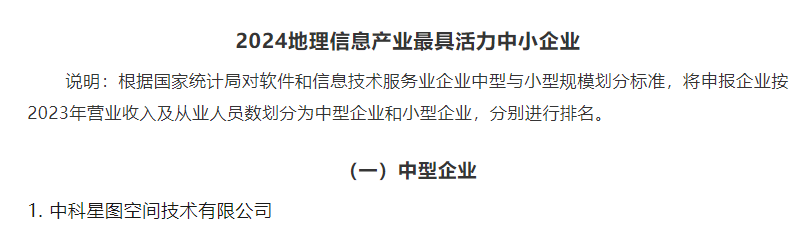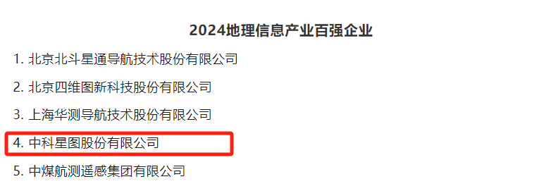 近日,中国地理信息产业协会发布了2024地理信息产业百强企业、最具活力中小企业、最具成长性企业等榜单。中科星图股份有限公司(简称“中科星图”)荣登2024地理信息产业百强企业榜单第四位、2024地理信息产业最具成长性企业榜单第五位。中科星图旗下中科星图空间技术有限公司(简称“星图空间”)荣登2024地理信息产业最具活力中型企业榜单第一位,2024地理信息产业最具成长性企业第七十三位。