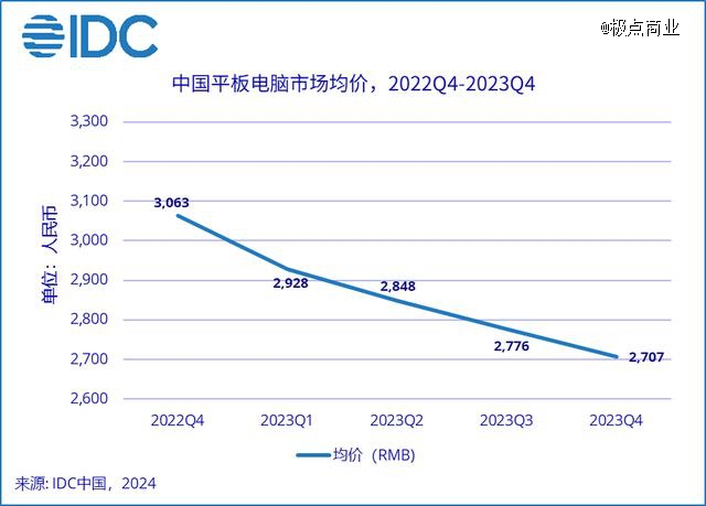 中国平板电脑市场均价目前正处于一路下滑的情况,从 2022 年第四季度的 3063 元,下滑到 2023年第四季度的2707 元。对苹果来说,*问题是产品线不合理——苹果iPad产品线较为混乱,且扎堆中高端,目前在售平板产品中,价格*的第九代iPad售价2599元起,但只有64G。这是国产平板竞争最为激烈的区间,苹果没有明显竞争优势。