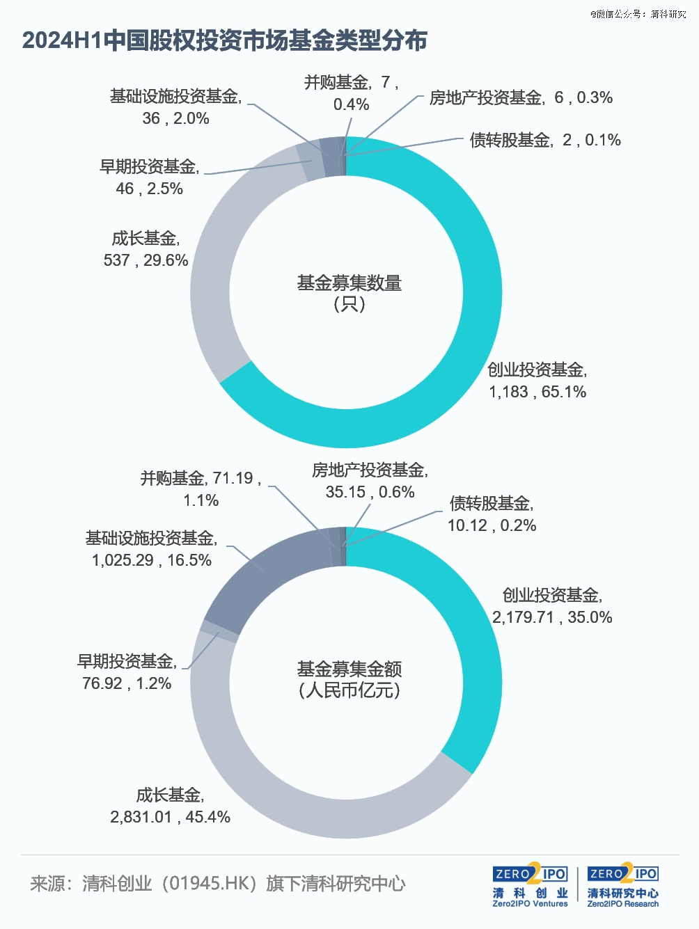 2024年上半年,创业投资基金数量持续*,占比维持在60%以上。据统计,共有1,183只创业投资基金完成新一轮募集,数量同比下降50.1%;募资规模为2,179.71亿元人民币,占比35.0%,相比去年同期下降了1.4pct。537只成长基金的募资规模合计达到2,831.01亿元人民币,数量和金额占全市场的比重分别较2023年上半年提高了0.2pct、2.9pct。