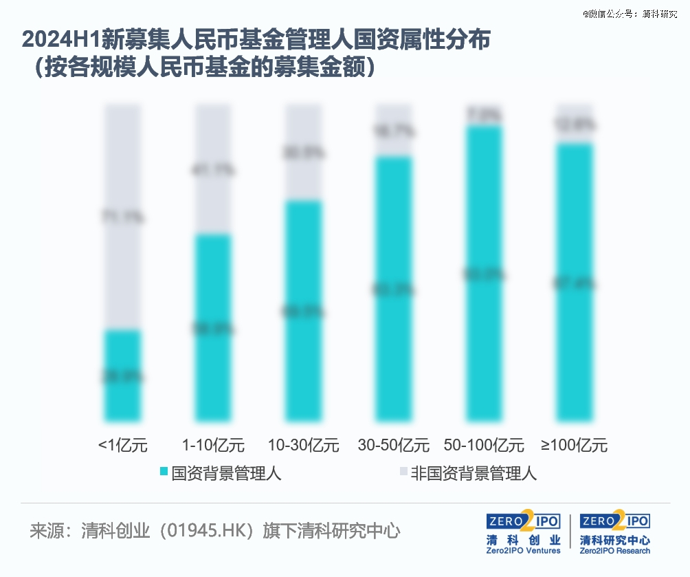 国资背景管理人的募资规模仍保持优势。除金额不足1亿元人民币的小规模基金外,其余各规模区间的新募集人民币基金中,国资背景管理人所管基金的新募集金额占比均超过五成。上半年新募集金额在30亿元及以上的人民币基金中,这一比例均在80%以上。