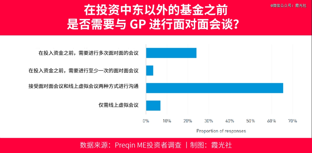 根据私募数据巨头Preqin(睿勤)发布的《中东融资指南》显示,25%的中东投资人,认为在投资中东地区以外的GP之前,需要经过多轮的面对面会议;而仅有不到10%的投资人,认为仅进行线上虚拟会议即可。