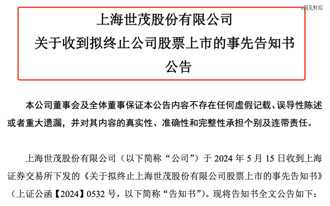 近日,世茂股份公告称,公司收到上交所下发的《关于拟终止上海世茂股份有限公司股票上市的事先告知书》。