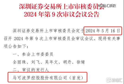 根据5月10日深交所上市委公告,上市委定于5月16日2024年第9次审议会议,对马可波罗的首发进行审议。在5月10日更新了财务资料后,马可波罗步入了上会环节。