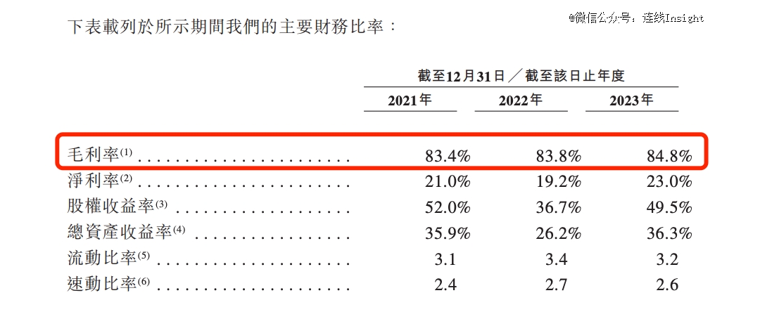 过去三个完整财年里,毛戈平公司的营收复合年增长率为35.3%,净利润复合年增长率为41.6%,毛利率也保持在较高水准,接近85%。其现金流状况也较为稳定,2023年末,其账上现金及等价物11.38亿元,同比增长了28%。