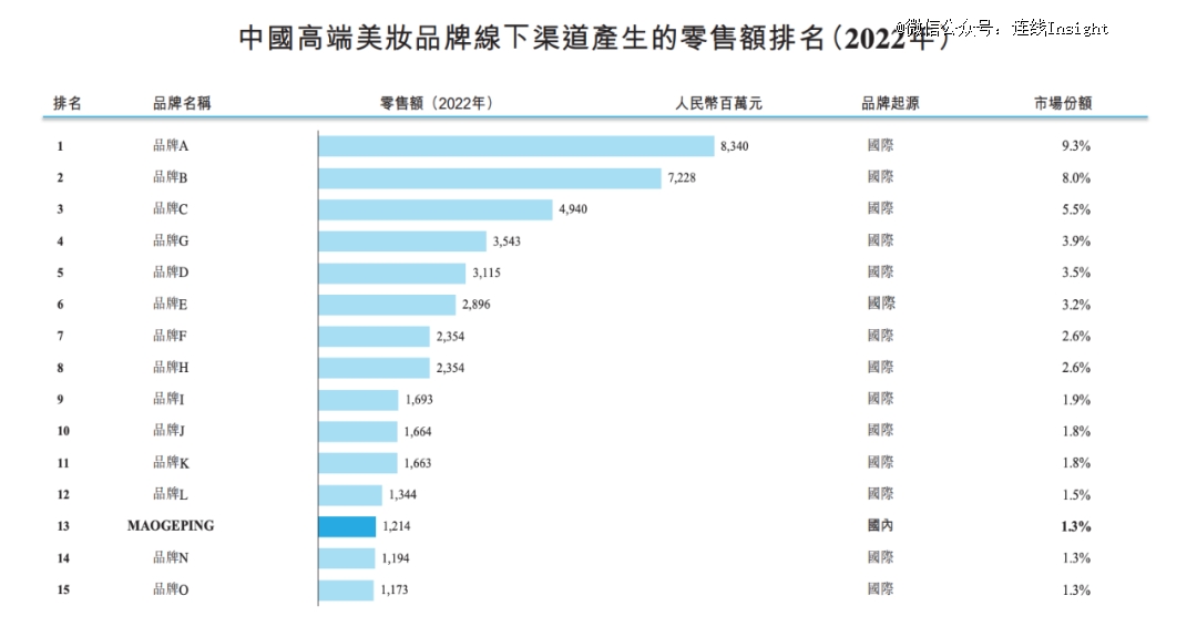 在招股书中,毛戈平引用弗若斯特沙利文的数据称,其是中国市场十大高端美妆集团中*一家中国公司,按2022年的零售额排名第八,旗下MAOGEPING是中国市场十五大高端美妆品牌中*的国货品牌,按2022年零售额排名第十五。