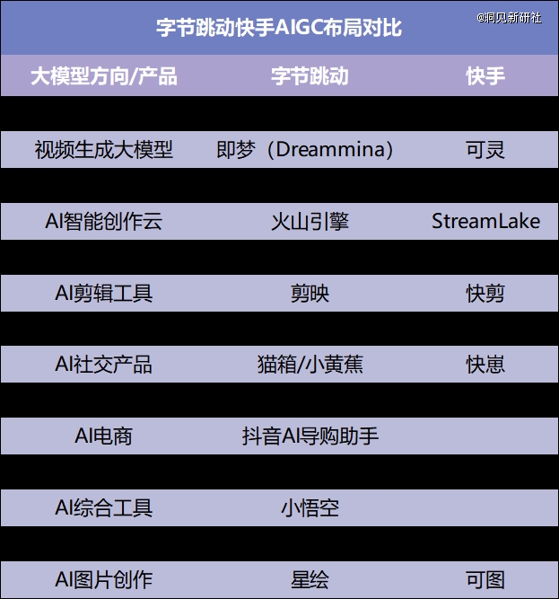 通用大模型方面,快手有快意,字节有豆包;AI图片创作快手有可图,字节有星绘;视频生成大模型,快手有可灵,字节用即梦相对,此外在AI音乐、剪辑工具、社交产品、*制作等多个领域,快手和字节都有相应的AIGC产品形成竞对。