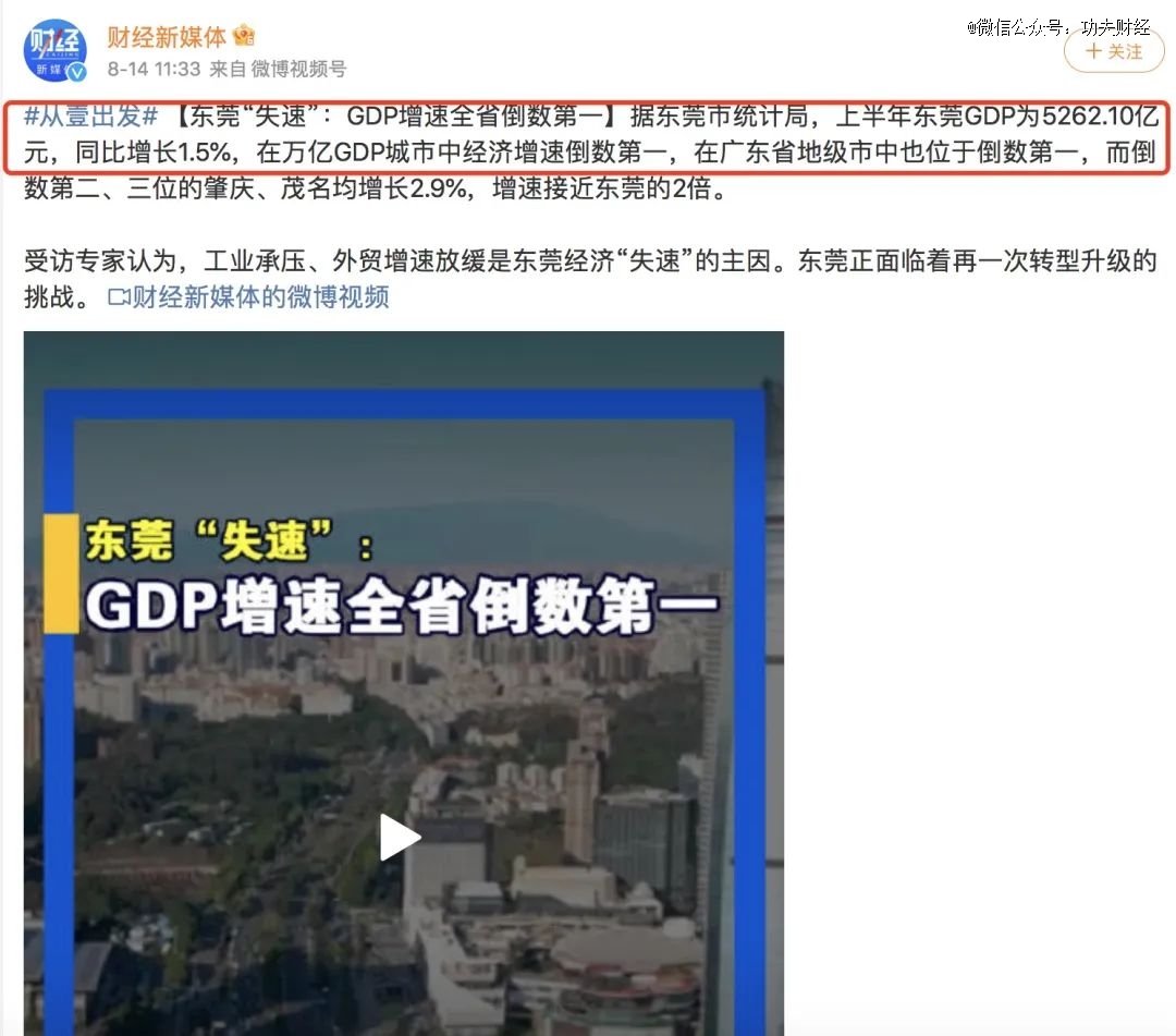 东莞上半年在万亿GDP城市中,经济增速倒数*。