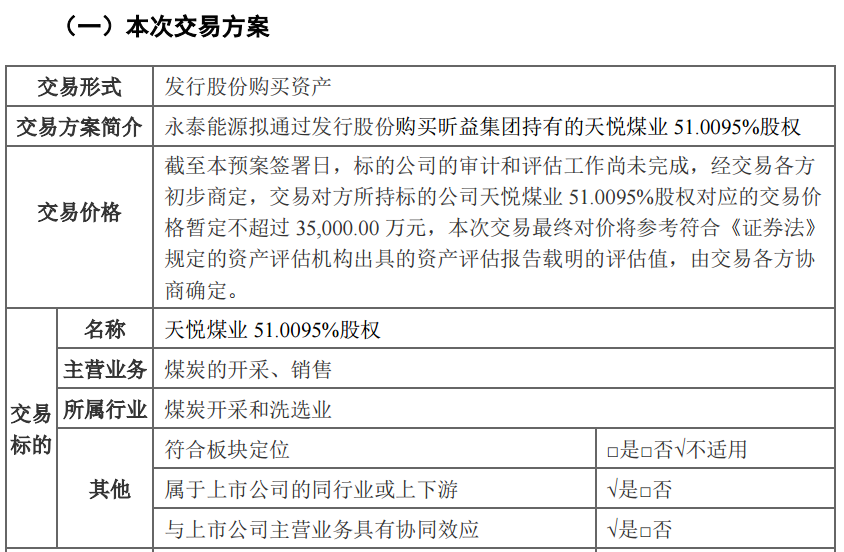 永泰能源公告称,公司拟通过发行股份方式,购买山西昕益能源集团有限公司所持天悦煤业51.0095%的股权。本次交易价格暂定不超过3.5亿元,最终交易对价将参考资产评估报告载明的评估值,由交易各方协商确定。