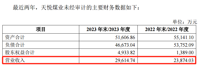 同时,天悦煤业未经审计的主要财务数据中,2022年、2023年的营业收入分别为2.39亿元、2.96亿元。