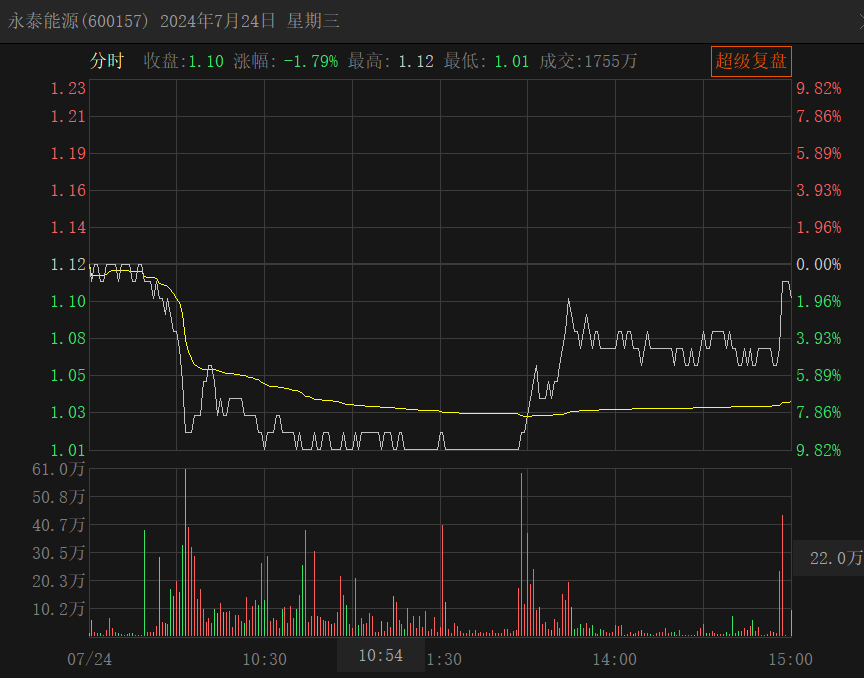 以7月24日为例,永泰能源盘中股价触及跌停达1.01元/股。之后公司股价有所反弹,截至当日收盘的股价为1.1元/股。