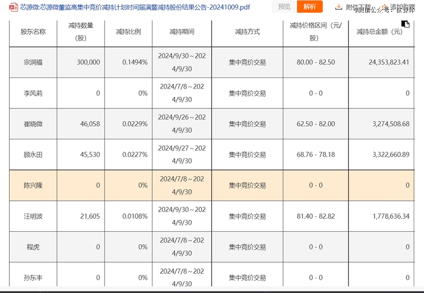 例如,芯源微(688037.SH)公告称,宗润福通过集中竞价交易方式合计已减持股份数量30万股,约占当前公司总股本的0.1494%;顾永田通过集中竞价交易方式合计已减持股份数量45530股,约占当前公司总股本的0.0227%;汪明波通过集中竞价交易方式合计已减持股份数量21605股,约占当前公司总股本的0.0108%。