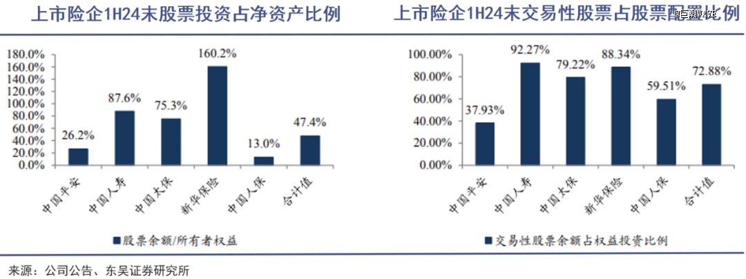 根据2024年中报信息,头部上市险企股票余额/所有者权益比值分别是新华保险160%、中国人寿88%、中国太保75%、中国平安26%、中国人保13%。