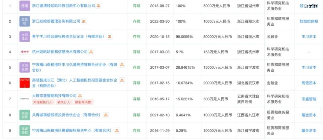 不止于此,宗馥莉本人也涉足创投圈已久。成立于2015年的宁波瑾汇投资管理有限公司是其个人投资平台,由她100%持股。