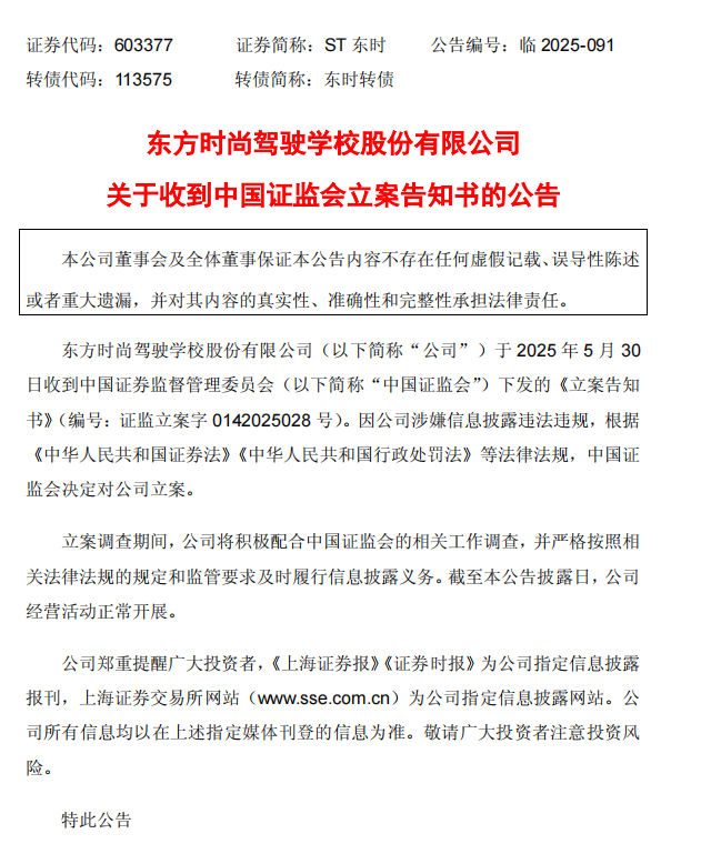 5月30日晚间,ST东时收到中国证监会下发的《立案告知书》,因其涉嫌信息披露违法违规,证监会决定对其立案调查。这是继因未能按期归还募集资金至专用账户被北京证监局出具警示函后,当月该公司第二次引发监管关注。