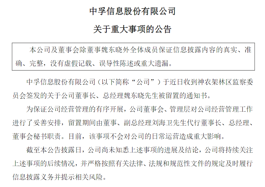 7月23日晚,中孚信息(300659)(300659.SZ)发布《关于重大事项的公告》。公司于近日收到神农架林区监察委员会签发的关于公司董事长、总经理魏东晓被留置的通知书。为保证公司经营管理的有序开展,公司董事会、管理层对公司经营管理工作进行了妥善安排,留置期间由董事、副总经理刘海卫代行董事长、总经理、董事会秘书职责。目前,该事项不会对公司的日常运营造成重大影响。截至本公告披露日,公司尚未知悉上述事项的进展及结论,公司将持续关注上述事项的后续情况,并严格按照有关法律、法规和规范性文件的规定及时履行信息披露义务并提示相关风险。