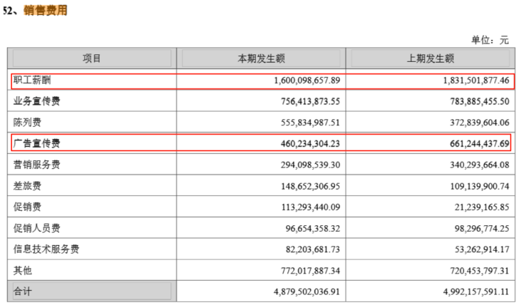 2024年公司销售费用同比减少2.26%,其中广告宣传费从6.6亿元锐减至4.6亿元,降幅高达30%。职工薪酬也从18.32亿元降至16亿元,降薪成为利润增长的助推器。