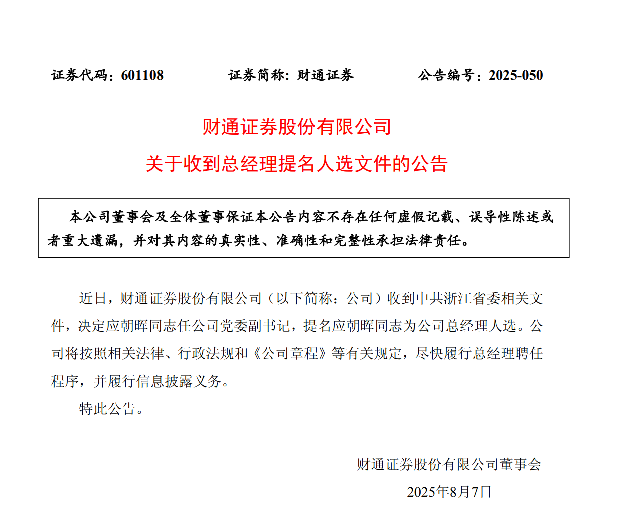 8月7日,财通证券发布公告称,收到中共浙江省委相关文件,决定应朝晖任公司党委副书记,提名应朝晖为公司总经理人选。财通证券表示,公司将按照相关法律、行政法规和《公司章程》等有关规定,尽快履行总经理聘任程序,并履行信息披露义务。