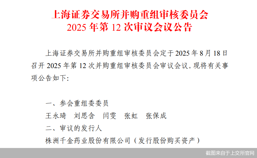 根据安排,上交所并购重组审核委员会定于8月18日召开2025年第12次并购重组审核委员会审议会议,审议千金药业发行股份购买资产事项。