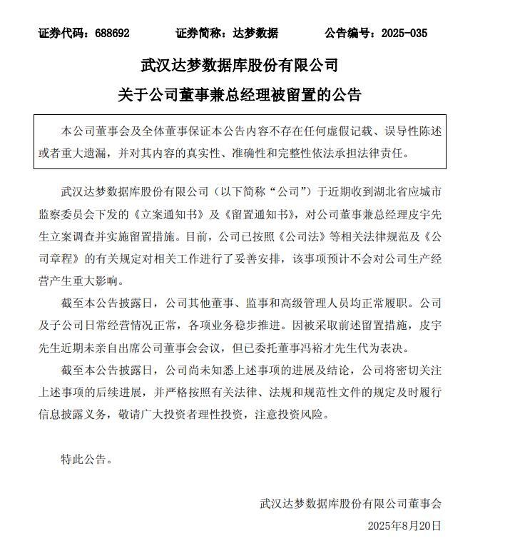 达梦数据19日晚间发布公告称,公司于近期收到湖北省应城市监察委员会下发的《立案通知书》及《留置通知书》,对公司董事兼总经理皮宇先生立案调查并实施留置措施。目前,公司已按照《公司法》等相关法律规范及《公司章程》的有关规定对相关工作进行了妥善安排,该事项预计不会对公司生产经营产生重大影响。