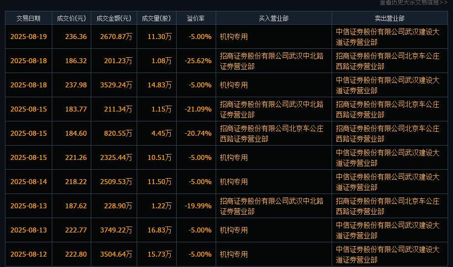 二级市场上,截至8月19日收盘,达梦数据跌0.68%,报248.8元/股,总市值281.7亿元。不过值得注意的是,从8月12日起至19日,达梦数据频现折价交易,溢价区间为-5%至-20.74%不等,中信证券股份有限公司武汉建设大道证券营业部和招商证券股份有限公司北京车公庄西路证券营部频现卖出。