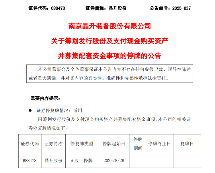 8月25日晚间,晶升股份(688478)公告,公司正在筹划以发行股份及支付现金的方式购买北京为准智能科技股份有限公司(简称“北京为准”)的控股权,同时拟募集配套资金。
