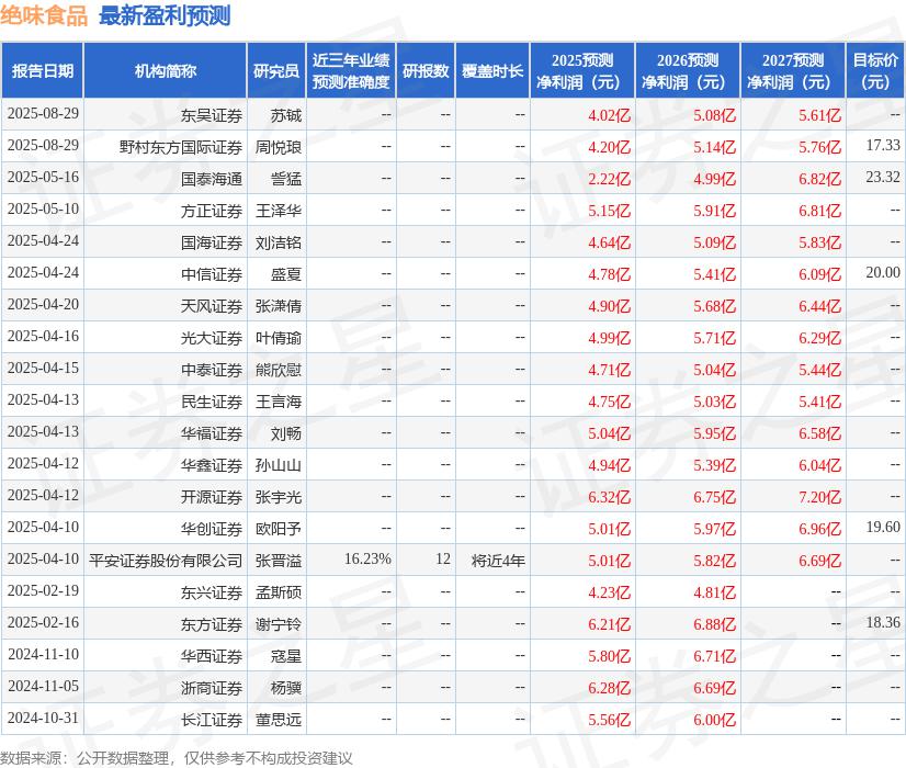 公司2025H1实现收入28.2亿元,同降15.6%,归母净利润1.75亿元,同降40.7%;其中2025Q2实现收入13.2亿元,同降19.8%,归母净利润0.55亿元,同比下滑57.6%。公司门店经营仍有压力,我们下调公司2025-2027年盈利预测,预计分别实现归母净利润3.9(-2.4)、5.0(-1.8)、5.3(-1.9)亿元,同增73.4%、26.7%、6.4%,当前股价对应PE分别为25.0、19.7、18.5倍,公司作为行业龙头,调整门店经营策略,卤味行业集中度有望进一步提升,美食生态圈企业有望逐步恢复,维持“增持”评级。