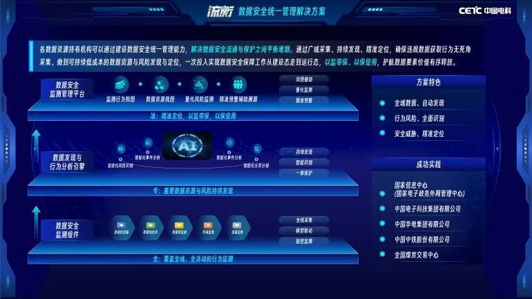 此外,面对数据在时空变化下的防护难题,电科网安“流衡”数据安全统一管理解决方案以“精准定位、以监促防、以防促用”为核心理念,为企业构建分层协同的数据安全治理体系。