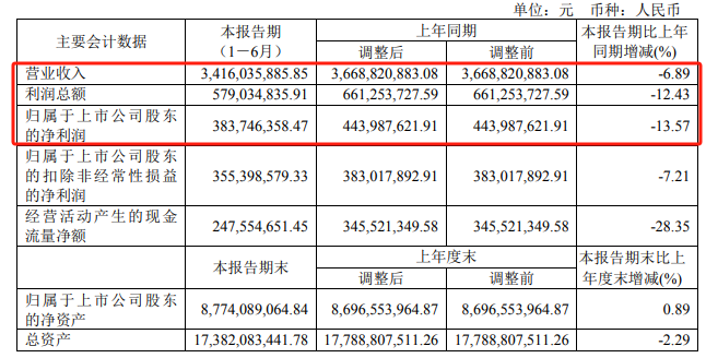 然而,陈德力上任之后的首份半年报显示,公司营收净利双双下滑。公司实现营业收入34.16亿元,同比下降6.89%;归母扣非净利润为3.55亿元,同比下降7.21%。